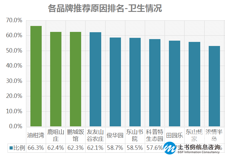 排名第一的是油柑灣,衛(wèi)生情況推薦率為66.3%;其次是鹿咀山莊,推薦率為62.4%;第三名是鵬城飯館,推薦率為62.3%。