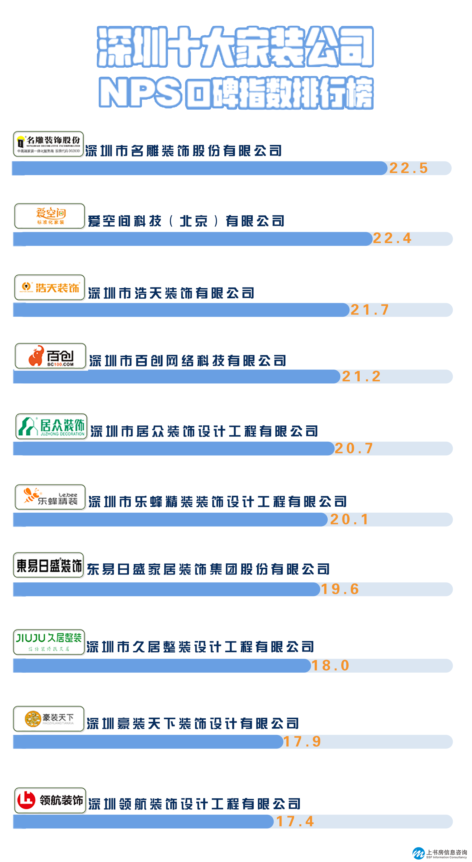 - 上書房信息咨詢受客戶委托對深圳市10家家裝公司進(jìn)行消費者NPS口碑調(diào)查。調(diào)研結(jié)果顯示,被調(diào)查的深圳市10家家裝公司NPS口碑凈推薦值平均為20.2。前三名為名雕裝飾股份22.5、愛空間裝飾22.4、浩天裝飾21.7。