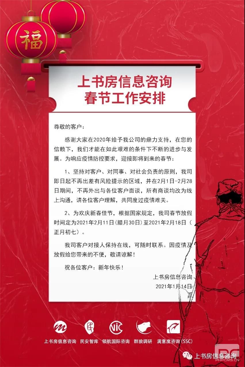 感謝大家在2020年給予我公司的鼎力支持,在您的信賴下,我們才能在如此艱難的條件下不斷的進步與發(fā)展。在2021年春節(jié)即將來臨之際,上書房信息咨詢?nèi)w員工以最誠摯的祝福和問候,恭祝大家新春愉快,合家歡樂,萬事如意,新年吉祥!為響應(yīng)疫情防控要求,迎接即將到來的春節(jié),我司將公布以下兩則消息: