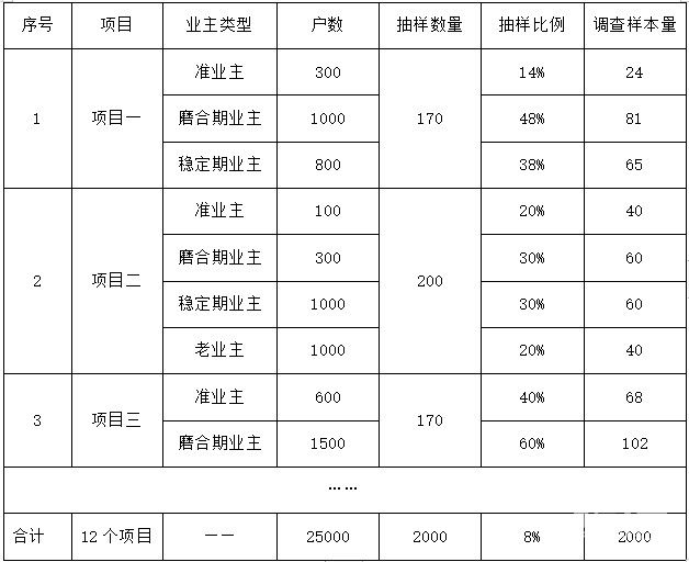 上書房信息咨詢將小區(qū)業(yè)主分類為準業(yè)主(合同簽約到準備交付階段)、磨合期業(yè)主(入住1年以內(nèi))、穩(wěn)定期業(yè)主(入住1-3年)、老業(yè)主(入住3年以上),并計算其數(shù)量占總體樣本的比例,如果占比呈現(xiàn)2:3:3:2的話,則調(diào)查樣本數(shù)為準業(yè)主56戶、磨合期業(yè)主83戶,穩(wěn)定企業(yè)主83戶,老業(yè)主56戶。