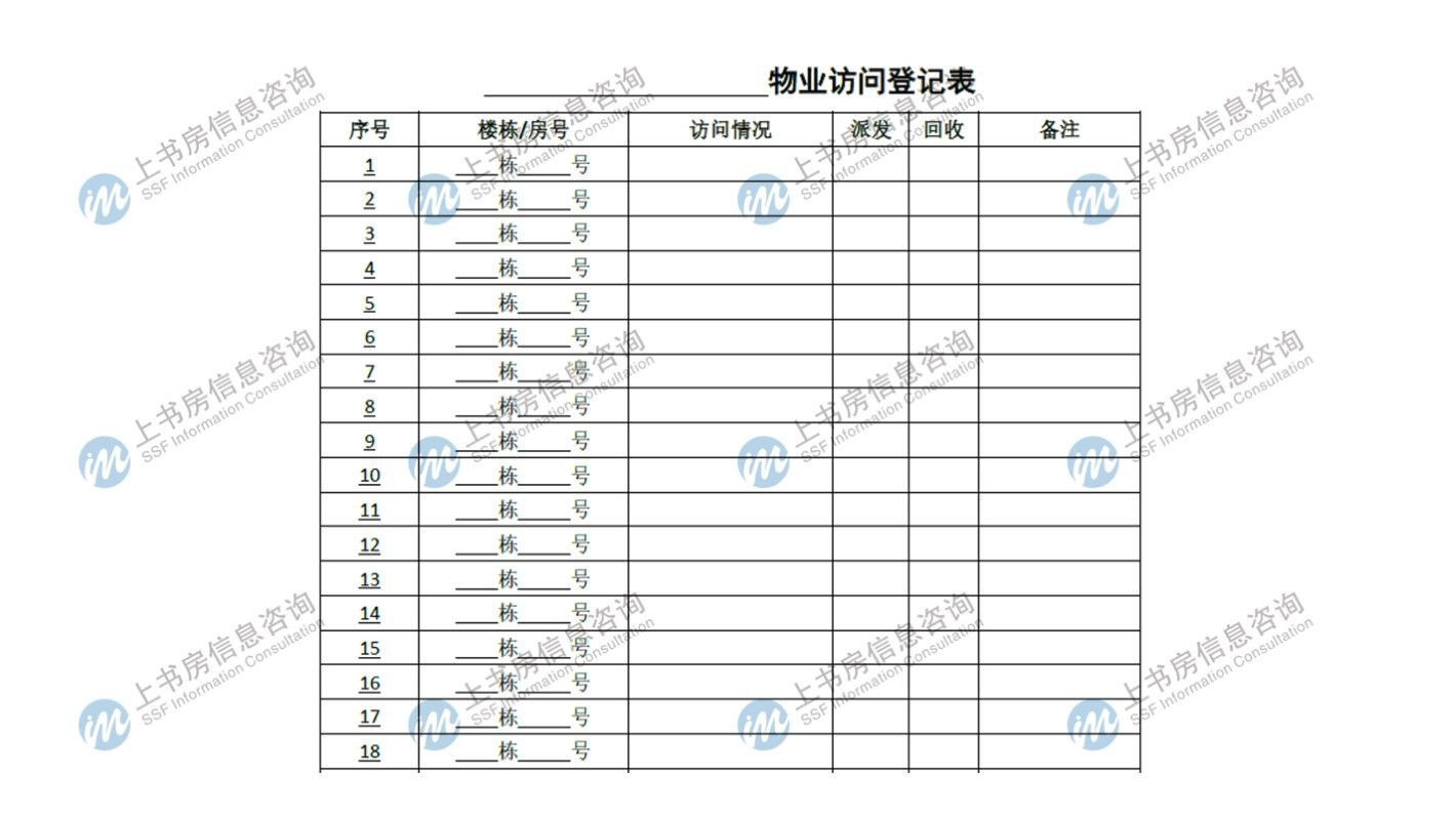 為了更高效、科學(xué)的完成入戶訪問(wèn),上書房信息咨詢現(xiàn)場(chǎng)執(zhí)行督導(dǎo)按照項(xiàng)目樓棟劃分區(qū)塊,分配相應(yīng)的訪問(wèn)員進(jìn)行入戶訪問(wèn),并要求訪問(wèn)員抄錄各樓棟走訪的房號(hào)信息。表格如下: