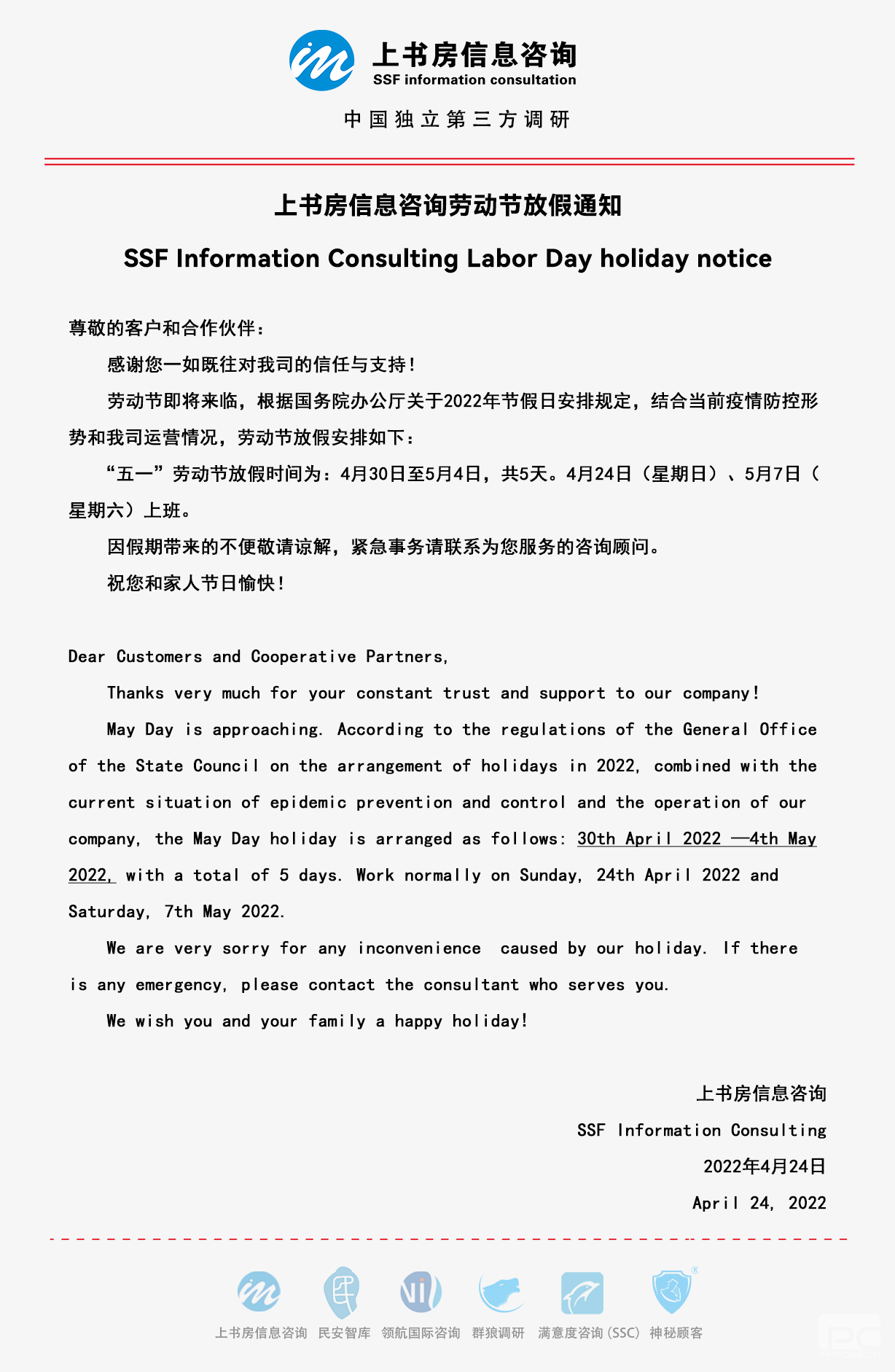 勞動(dòng)節(jié)即將來臨,根據(jù)國務(wù)院辦公廳關(guān)于2022年節(jié)假日安排規(guī)定,結(jié)合當(dāng)前疫情防控形勢和我司運(yùn)營情況,勞動(dòng)節(jié)放假安排如下:
