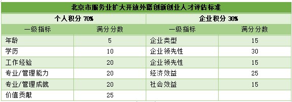 該積分評(píng)估制度借鑒了美國(guó)、加拿大等地經(jīng)驗(yàn),圍繞學(xué)歷、年齡、在華工作年限、工作方式等設(shè)置了多項(xiàng)指標(biāo)。其中,個(gè)人積分評(píng)估標(biāo)準(zhǔn)(權(quán)重70%),企業(yè)積分評(píng)估標(biāo)準(zhǔn)(權(quán)重30%)。個(gè)人積分的一級(jí)指標(biāo)與滿分分?jǐn)?shù)分別為:年齡5分、學(xué)歷10分、工作經(jīng)驗(yàn)20分、專業(yè)/管理能力20分、專業(yè)/管理成就20分和價(jià)值貢獻(xiàn)25分。企業(yè)積分的一級(jí)指標(biāo)與滿分分?jǐn)?shù)為:企業(yè)類型15分、企業(yè)領(lǐng)先性30分、企業(yè)創(chuàng)新性15分、經(jīng)濟(jì)效益25分和社會(huì)效益15分。