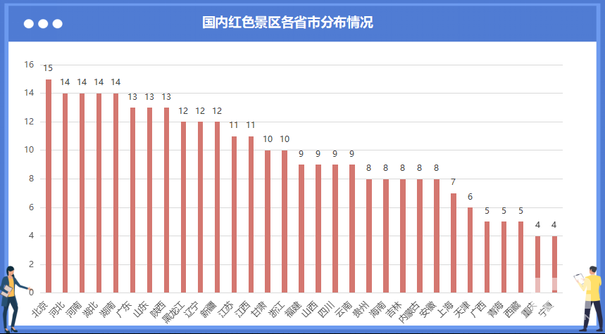 國內(nèi)紅色景區(qū)最多的省份是北京,為265個(gè),其次是河北省、河南省、湖北省、湖南省,均為14個(gè)。TOP10的省份還有:廣東省、山東市、陜西市、黑龍江省、遼寧省、新疆。