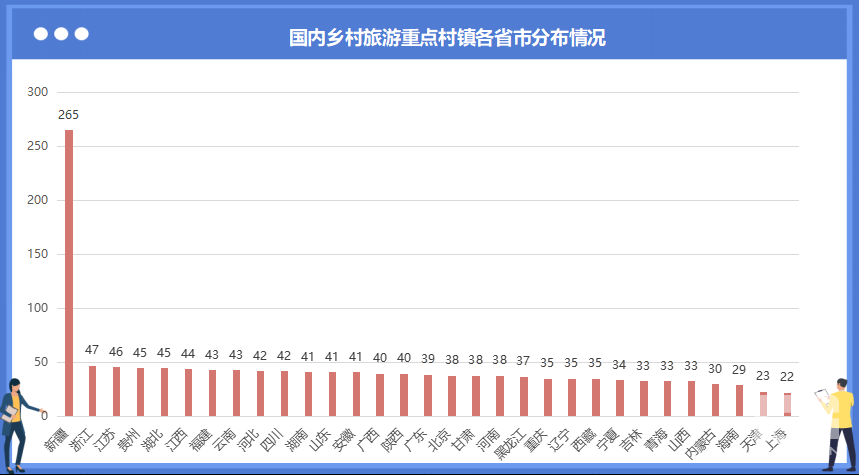 國內(nèi)鄉(xiāng)村旅游重點(diǎn)村鎮(zhèn)最多的省份是新疆,為265個(gè),其余省市鄉(xiāng)村旅游重點(diǎn)村鎮(zhèn)數(shù)量在20-50個(gè)之間。