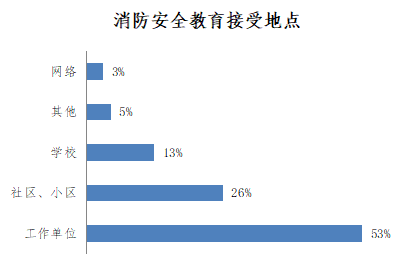 結果顯示,深圳市居民更多是在工作單位以及居住的場所接受相應的消防安全宣傳教育。當今互聯(lián)網飛速發(fā)展,信息共享更為方快捷,但本次數據顯示,居民在網絡接受消防安全宣傳的比例僅為3%,在互聯(lián)網各渠道看到的相關新聞資訊仍不夠普遍。
