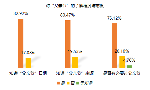 大部分人都知道“父親節(jié)”的日期(82.92%)和來源(80.47%),并認(rèn)為有必要過“父親節(jié)”(75.12%),這說明在大部分人心中,“父親節(jié)”是一個(gè)值得重視和慶祝的節(jié)日。覺得沒有必要過“父親節(jié)”的主要是41-50歲的離異男性,他們認(rèn)為沒有必要過父親節(jié)的原因可能是并沒有得到應(yīng)有的關(guān)注和尊重,應(yīng)增加對(duì)他們的關(guān)心。