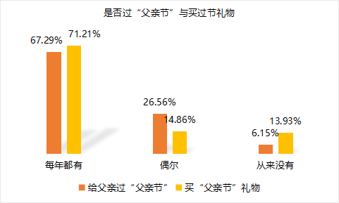 超過95%的人都有過“父親節(jié)”的經(jīng)歷,超過八成(86.07%)的人會(huì)買禮物,送禮物(服飾、保健品等)是主要的過節(jié)方式