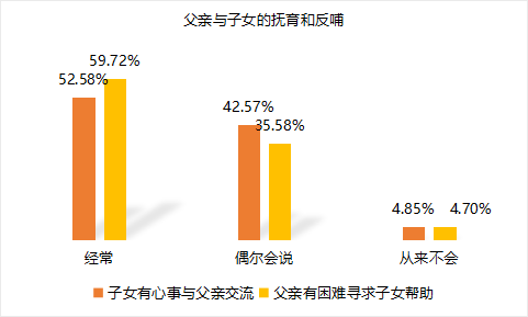 當(dāng)被問及父親有困難是否會(huì)找你幫忙時(shí),近60%的人回答“經(jīng)常會(huì)找你幫忙”。這既反映出父親對(duì)子女一定的依賴性,也反映出父輩與子女之間撫育與反哺的和諧親子關(guān)系。