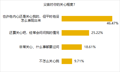 46.47%的人認(rèn)為父親“也許內(nèi)心還是關(guān)心我的,但平時(shí)他沒怎么表現(xiàn)出來”,這可能是因?yàn)楦赣H作為男性、長輩和家中的頂梁柱,讓他在情感表達(dá)上要比女性和晚輩更加緘默和難以察覺。也有善于表達(dá)自己對(duì)子女關(guān)心的父親(43.83%),僅有9.71%的人認(rèn)為父親不怎么關(guān)心自己。相比之下,男性更傾向于認(rèn)為父親“還算關(guān)心我,經(jīng)常問問我的情況”,而已婚、大學(xué)本科人更傾向于認(rèn)為父親“什么事情都要過問”。