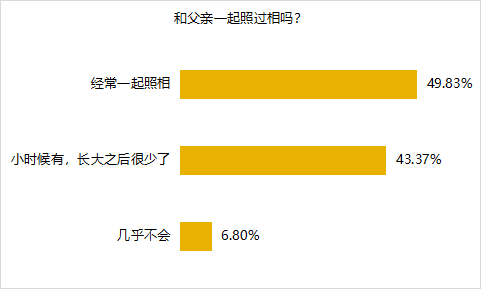 在日常情感回饋上,拍照作為記錄日常生活和感情的方式,也體現(xiàn)了合照的人的重視,和父親合照表達(dá)了對(duì)父親的尊重認(rèn)可。有近一半(49.83%)的人表示會(huì)經(jīng)常和父親一起拍照,但也有43.37%表示小時(shí)候才經(jīng)常拍照,長大之后很少了。這可能是因?yàn)殚L大之后不像小時(shí)候可以毫無顧忌表達(dá)感情,但隨著子女長大,父親也在變老,反而更加需要情感關(guān)懷。