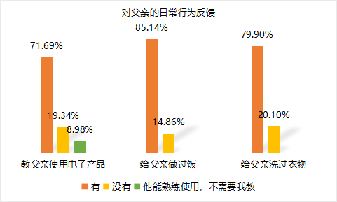 在日常實(shí)際行動(dòng)上,有71.69%的人教過父親使用電子產(chǎn)品,有85.14%為父親洗過衣服;有79.90%為父親做過飯。這都是從身邊點(diǎn)滴小事做起來回饋父親的方式。