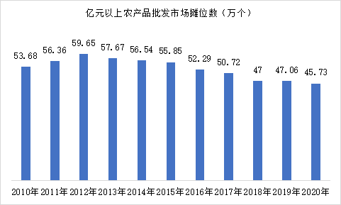 國家統(tǒng)計局?jǐn)?shù)據(jù)顯示,2019年我國億元以上農(nóng)產(chǎn)品批發(fā)市場有796個,這個數(shù)字在2020年變成771個;2019年我國億元以上農(nóng)產(chǎn)品批發(fā)市場攤位數(shù)為47.06萬個,到2020年,批發(fā)市場攤位數(shù)約為45.73萬個。其中蔬菜市場攤位數(shù)最多,其次為水產(chǎn)品及干鮮果品市場攤位數(shù)。