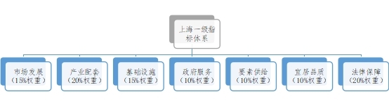 立足于全球范圍內(nèi)的經(jīng)濟發(fā)展程度較高城市的特點,選取市場發(fā)展、產(chǎn)業(yè)配套、基礎設施、政府服務、要素供給、宜居品質(zhì)和法律保障7個一級指標、23個二級指標、41個三級指標,構(gòu)成能夠進行全球評估的城市營商環(huán)境指標體系。7個一級指標的權(quán)重分別為:市場發(fā)展(15%權(quán)重)、產(chǎn)業(yè)配套(20%權(quán)重)、基礎設施(15%權(quán)重)、政府服務(10%權(quán)重)、要素供給(10%權(quán)重)、宜居品質(zhì)(10%權(quán)重)、法律保障(20%權(quán)重)。