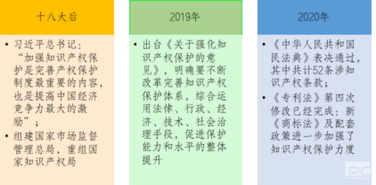 2020年5月,《中華人民共和國民法典》表決通過,其中共計(jì)52條涉知識(shí)產(chǎn)權(quán)條款,分布于總則和各分編,對新時(shí)代我國的知識(shí)產(chǎn)權(quán)制度的發(fā)展和完善具有重要的引領(lǐng)和示范作用。2020年10月,《專利法》第四次修改已經(jīng)完成:新《商標(biāo)法》及配套政策進(jìn)一步加強(qiáng)了知識(shí)產(chǎn)權(quán)保護(hù)力度。