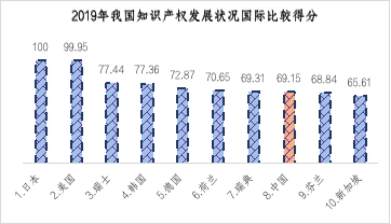 從國際比較來看,我國知識(shí)產(chǎn)權(quán)發(fā)展水平世界排名從2015年的第17位躍升至2019年的第8位,得分從67.08分提升至69.15分。其中,知識(shí)產(chǎn)權(quán)環(huán)境指數(shù)得分同比增長3.44%,反映出近年來我國在強(qiáng)化知識(shí)產(chǎn)權(quán)保護(hù)優(yōu)化營商環(huán)境方面取得的積極成效,體現(xiàn)出我國具備了向知識(shí)產(chǎn)權(quán)強(qiáng)國邁進(jìn)的堅(jiān)實(shí)基礎(chǔ)。