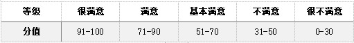 此外,借鑒國(guó)外測(cè)量用戶滿意度的有關(guān)理論和經(jīng)驗(yàn),以上具體的因素都可分成很滿意、滿意、基本滿意、不滿意、很不滿意5個(gè)滿意度等級(jí),也可將這5個(gè)等級(jí)換算成分?jǐn)?shù),對(duì)評(píng)測(cè)項(xiàng)目進(jìn)行判斷。