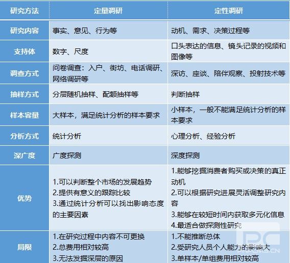 定性調(diào)查和定量調(diào)查兩者對比中,定性調(diào)研主要用于測試?yán)碚摵图僬f,而定量調(diào)研是通過數(shù)學(xué)和統(tǒng)計學(xué)的方法來分析市場現(xiàn)狀,同時利用數(shù)字、圖形和表格來表達(dá)觀點(diǎn),具體差異如下表所示。