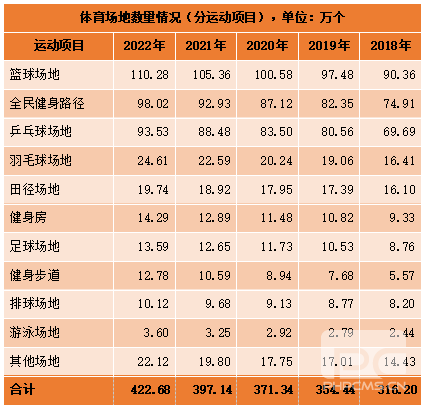 2022年全國(guó)體育場(chǎng)地422.68萬(wàn)個(gè),體育場(chǎng)地面積37.02億平方米,人均體育場(chǎng)地面積2.62平方米。不同機(jī)構(gòu)體育場(chǎng)地面積近年增長(zhǎng)最快的是居委會(huì)的,每年增長(zhǎng)率均在13%以上,其次是村委會(huì)、機(jī)關(guān)和其他組織機(jī)構(gòu)的;不同運(yùn)動(dòng)項(xiàng)目場(chǎng)地?cái)?shù)量近年來(lái)增長(zhǎng)最快的是健身步道,每年增長(zhǎng)率在16%以上,其次是健身房、游泳場(chǎng)地和足球場(chǎng)地。