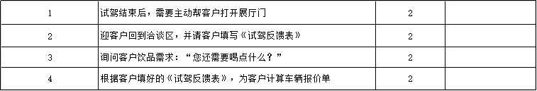 試駕結(jié)束后,并不代表服務(wù)就結(jié)束了,神秘顧客會考察后續(xù)的服務(wù)仔細(xì)程度,比如是否幫開車門、幫開展廳門、后續(xù)洽談是否有及時提供飲品等。