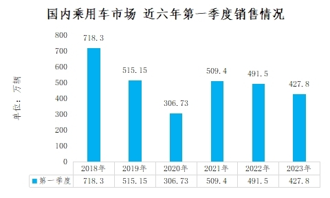 2023年一季度汽車銷售量為427.8萬(wàn)輛,同比下降13.0%。除去2020年第一季度外,自2018年起,國(guó)內(nèi)乘用車一季度銷量逐年下降。